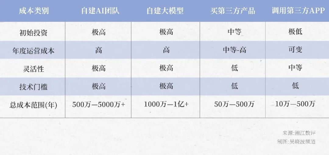 搭建AI基础措施需要大量资金干涉。例如来说,如若要自建AI团队,企业需要采购GPU、服务器、传感结尾、数采征战、数据及数据处理服务等,再组建一个东说念主均年薪50—100万、3—5东说念主的中枢工程师团队,资本粗陋上千万。