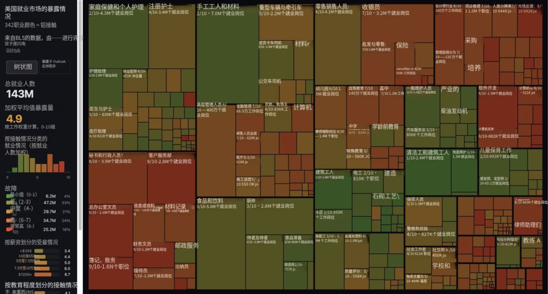 OpenAI 衔接首创东说念主Andrej Karpathy对好意思国342个奇迹作念了一次AI替代风险泄露度评分,发现存41%的劳工落在高风险区,其中财务、文员、信息服务等是重灾地。
