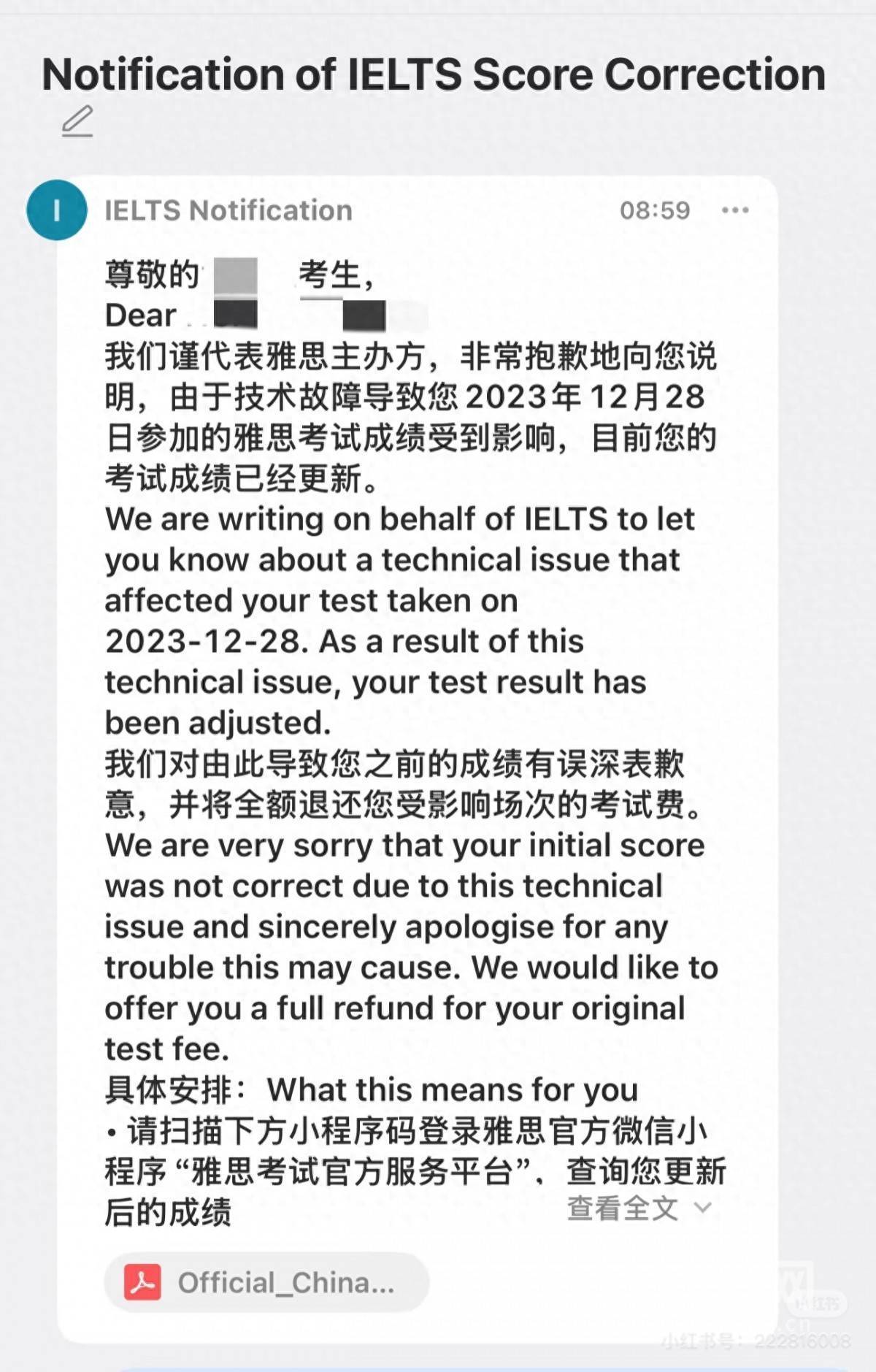 雅想方面还明确了具体善后进程:考生需通过雅想官方微信小枢纽查询更新收获、阐明邮寄地址以获得新版纸质收获单,退费需在2026年5月1日前通过小枢纽办理,瞻望30个职责日到账。