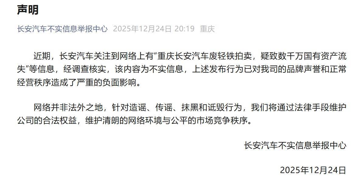 12月24日,长安汽车空虚信息举报中心发布声明: